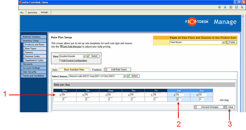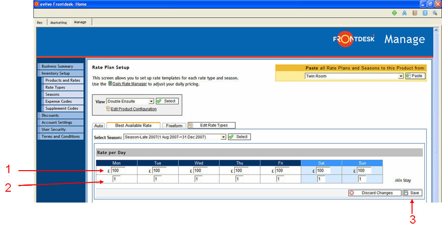 The first is the Rate Per Day which is entered to create a Rate Plan and can be amended using the Daily Rate Manager. Minimum stay requirements can be applied to these daily rates.