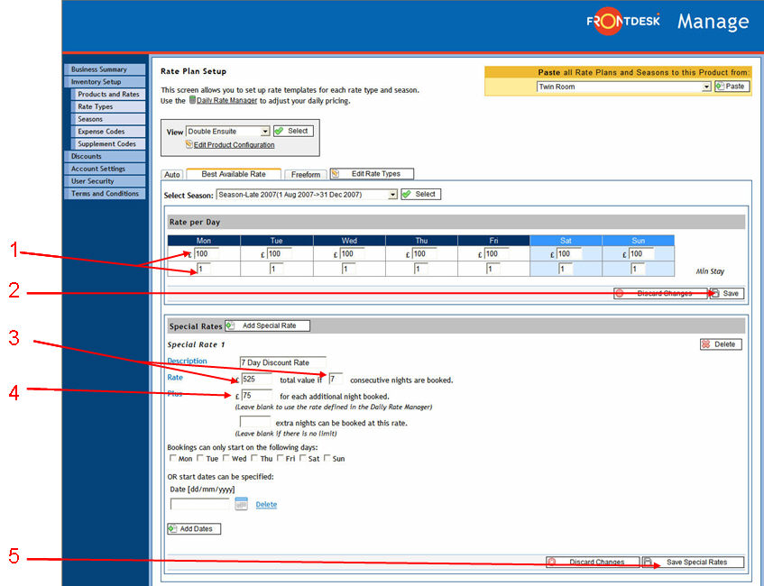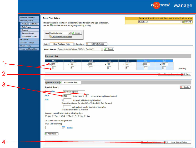 If stays must be booked set number of nights, more than one Special Rate can be applied to cater for the pricing scenario where there is a fixed price for 3, 4, 5, 7 or 14 night stays for the same product. Simply click on "