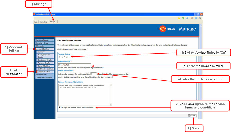 In the SMS Notification Service screen, switch the Service Status to ‘On’