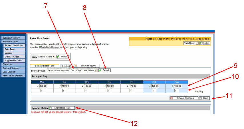 15. Rate Plans need to be created for each Product. Follow steps 4-13 to create Rate Plans for subsequent Products. If the Rate Plans are identical for two Products (eg Twin Ensuite and Double Ensuite), you can copy the Rate Plans from one Product to another using the Paste all Rate Plans and Seasons box at the top left of the Rate Plan Setup screen.